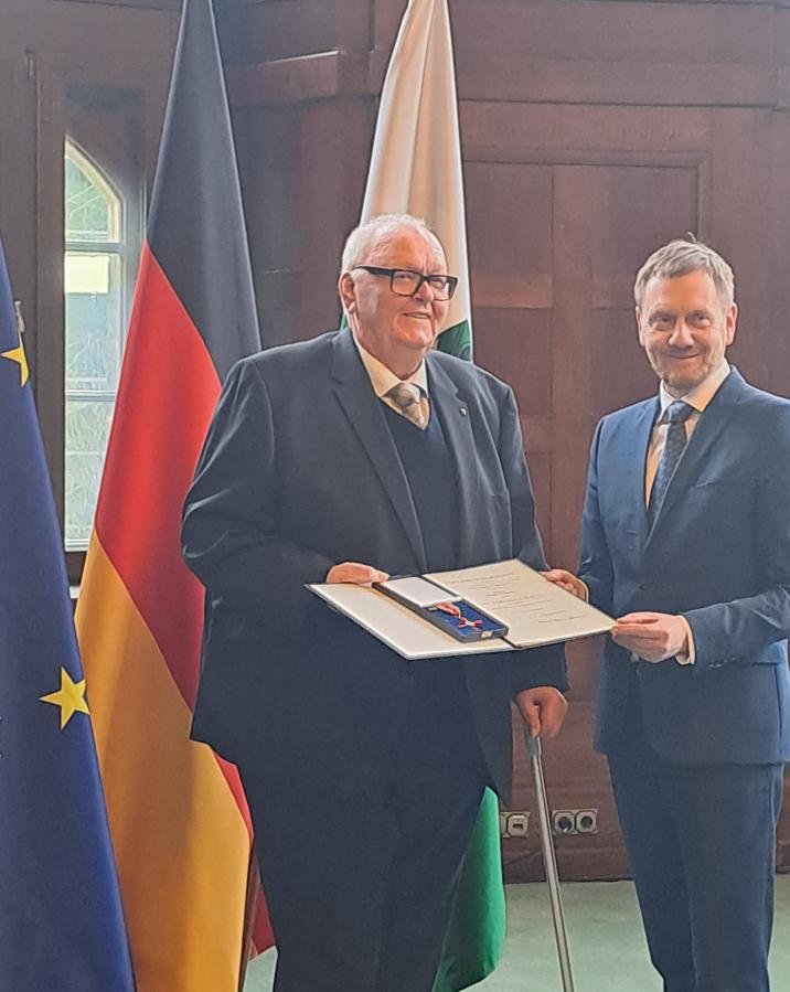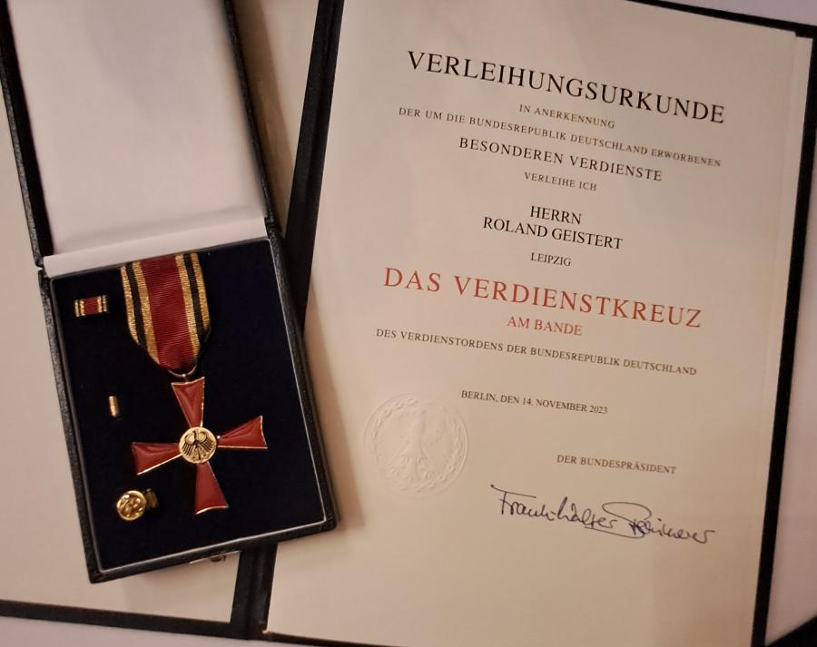 Für sein herausragendes ehrenamtliches Engagement wurde Herrn Roland Geistert das Bundesverdienstkreuz (Verdienstkreuz am Bande) verliehen. „Das war für mich eine riesengroße Überraschung, ich habe überhaupt nicht damit gerechnet“, sagt Roland Geistert als er kurz vor Weihnachten 2023 eine Einladung des Bundespräsidenten Frank-Walter Steinmeier in die Sächsische Staatskanzlei erhielt. „Als ich erfahren habe, dass ich das Bundesverdienstkreuz bekomme, war ich sehr gerührt. Ich fühle mich sehr geehrt“, sagt Roland Geistert.